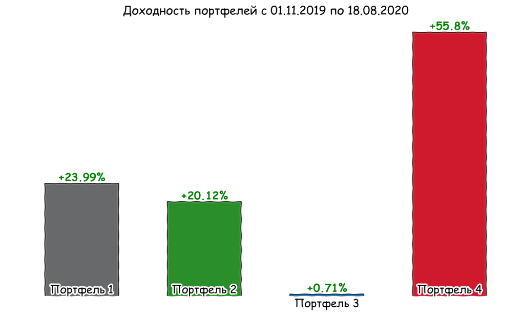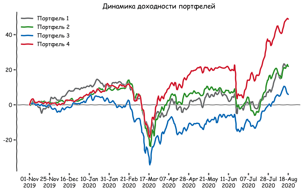 Еще в ноябре 2019 года я случайным образом составил четыре портфеля из акций российских компаний, а также «вложил» в них условные 100 000 рублей и просто стал наблюдать за ними. Кстати об акциях, которые входят в портфели: