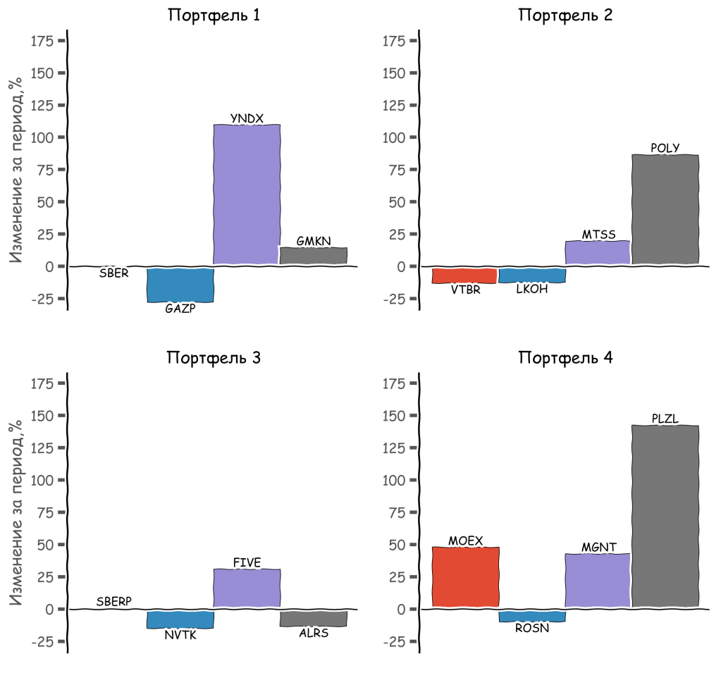 - Портфель 1: Сбербанк, Газпром, Яндекс, Норникель