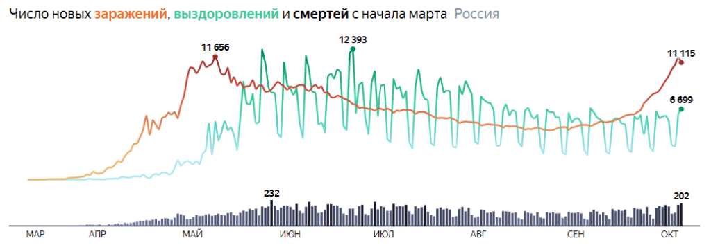 Количество заболевших серьезно увеличивается. После первой волны статистика по числу заболеваний показывала удивительную стабильность. Но сейчас стабильность закончилась: число заболевших подступается к «рекорду» первой волны. Кажется, что еще несколько дней, и рекорд будет побит.