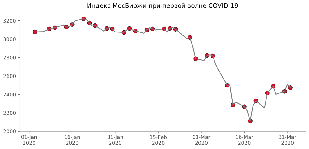 Одними из первых на первую волну отреагировали финансовые рынки. Уже к концу февраля, когда в день фиксировалось менее 100 заболевших COVID-19, индекс МосБиржи упал почти на 10%. А когда стало понятно, что ситуация не решится за 1 день, индекс падал еще на 17% в течение месяца.